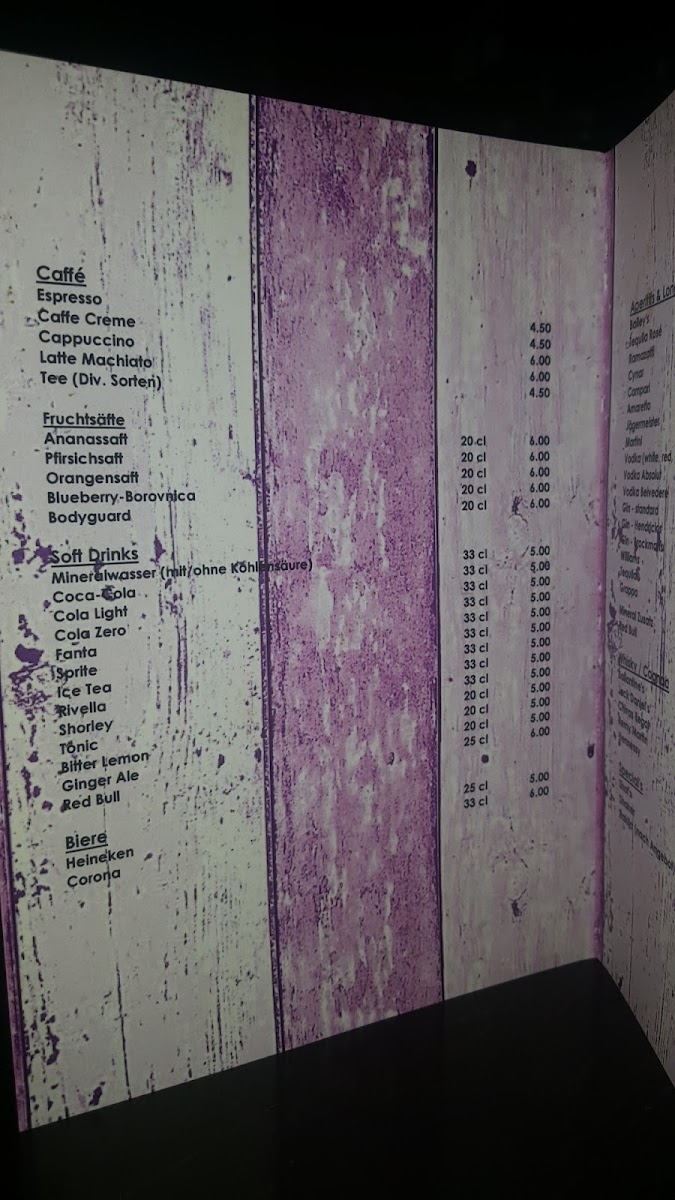 The beverage offerings include traditional coffee preparations such as ristretto and cappuccino, as well as a variety of alcoholic drinks including aperol spritz and rakija dunja. These beverages cover both hot and cold options, catering to different preferences.